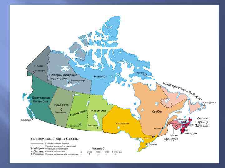 Регионы Канады 1. Центральный район (Онтарио и Квебек) 2. Степной район (Манитоба, Саскачеван, Альберта 3. Дальний Запад или Тихоокеанский район – (Британская Колумбия) 4. Атлантический район (Ньфаундленд, остров принца Эдуарда, Новая Шотландия, Нью. Брансуик) 5. Север (Нунавут, Северо-Западные территории, Юкон)