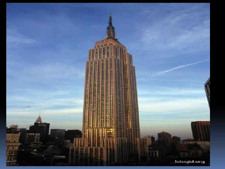 Эмпайр-стейт-билдинг, Нью-Йорк, США Эмпайр-стейт-билдинг — небоскреб высотой 102 этажа, 381 м. (448 м. с антенной), возведенный в стиле Арт Деко