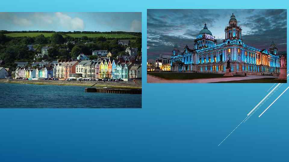 Северная Ирландия Страна Административно-политическая часть Соединённого Королевства Великобритании и Северной Ирландии, расположенная в северо-восточной части острова Ирландия. Столица и крупнейший город - Белфаст. Северную Ирландию не следует путать с Ольстером: Ольстер - это историческая провинция Ирландии, состоящая из 9 графств; Северная Ирландия же - это административно-территориальная единица Великобритании, включающая в себя только 6 из 9 графств Ольстера. Википедия Площадь13 843 км² Население 1 852 168 чел. Столица Белфаст Крупнейшие города Белфаст, Лондондерри Телефонный код 44 Языки Ирландский язык, Английский язык НЕМНОГО ИНФОРМАЦИИ