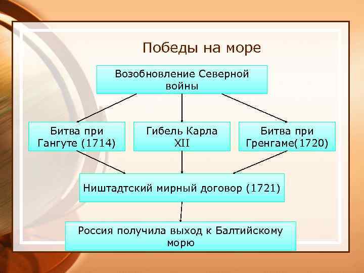 Победы на море Возобновление Северной войны Битва при Гангуте (1714) Гибель Карла XII Битва при Гренгаме(1720) Ништадтский мирный договор (1721) Россия получила выход к Балтийскому морю