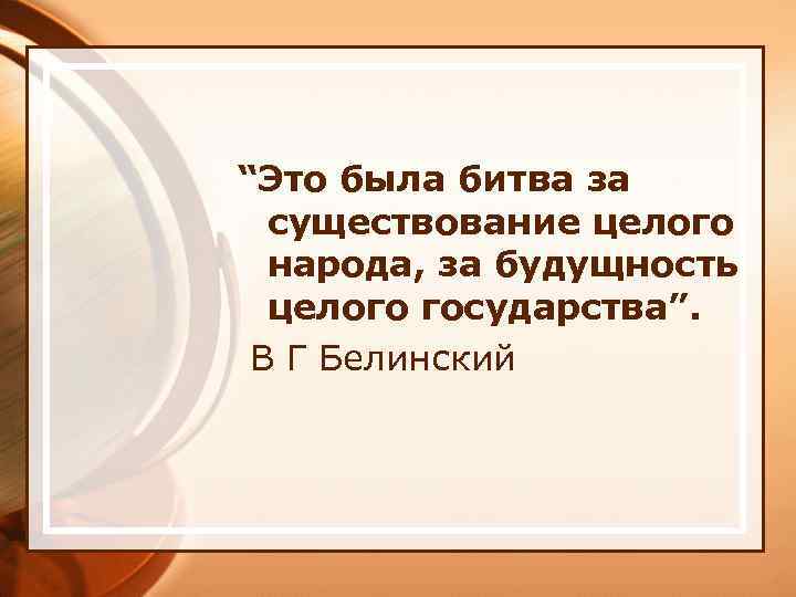 “Это была битва за существование целого народа, за будущность целого государства”. В Г Белинский