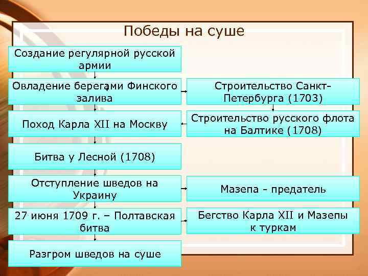 Победы на суше Создание регулярной русской армии Овладение берегами Финского залива Строительство Санкт. Петербурга (1703) Поход Карла XII на Москву Строительство русского флота на Балтике (1708) Битва у Лесной (1708) Отступление шведов на Украину Мазепа - предатель 27 июня 1709 г. – Полтавская битва Бегство Карла XII и Мазепы к туркам Разгром шведов на суше