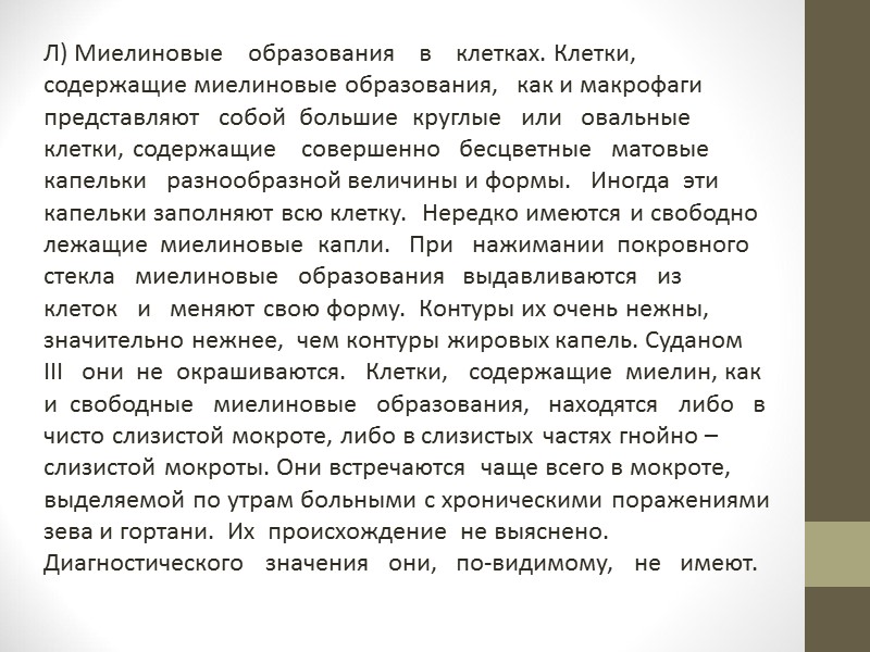 Л) Миелиновые образования в клетках. Клетки, содержащие миелиновые образования, как и макрофаги представляют собой большие круглые или овальные клетки, содержащие совершенно бесцветные матовые капельки разнообразной величины и формы. Иногда эти капельки заполняют всю клетку. Нередко имеются и свободно лежащие миелиновые капли. При нажимании покровного стекла миелиновые образования выдавливаются из клеток и меняют свою форму. Контуры их очень нежны, значительно нежнее, чем контуры жировых капель. Суданом III они не окрашиваются. Клетки, содержащие миелин, как и свободные миелиновые образования, находятся либо в чисто слизистой мокроте, либо в слизистых частях гнойно – слизистой мокроты. Они встречаются чаще всего в мокроте, выделяемой по утрам больными с хроническими поражениями зева и гортани. Их происхождение не выяснено. Диагностического значения они, по-видимому, не имеют.
