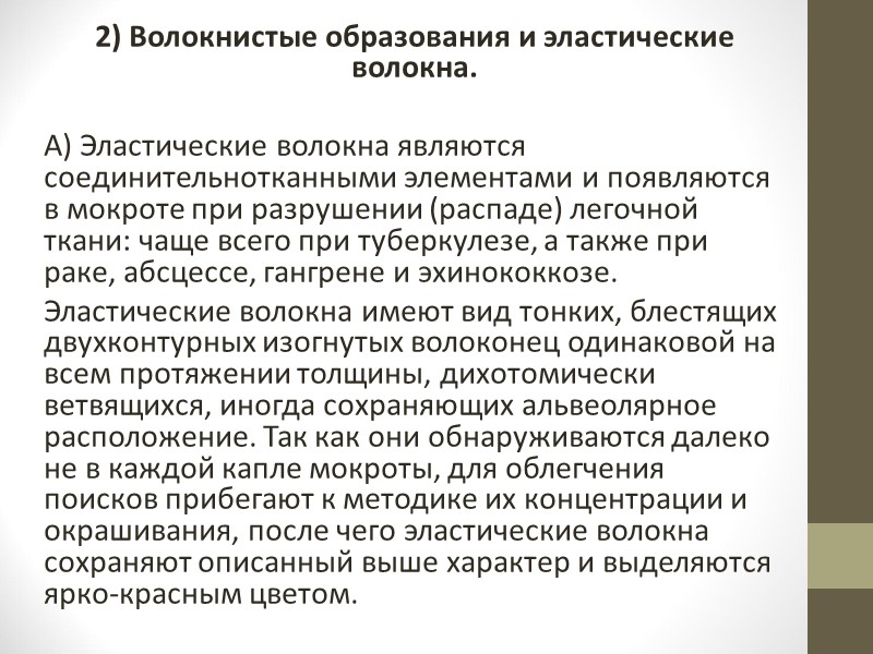 2) Волокнистые образования и эластические волокна. А) Эластические волокна являются соединительнотканными элементами и появляются в мокроте при разрушении (распаде) легочной ткани: чаще всего при туберкулезе, а также при раке, абсцессе, гангрене и эхинококкозе. Эластические волокна имеют вид тонких, блестящих двухконтурных изогнутых волоконец одинаковой на всем протяжении толщины, дихотомически ветвящихся, иногда сохраняющих альвеолярное расположение. Так как они обнаруживаются далеко не в каждой капле мокроты, для облегчения поисков прибегают к методике их концентрации и окрашивания, после чего эластические волокна сохраняют описанный выше характер и выделяются ярко-красным цветом.