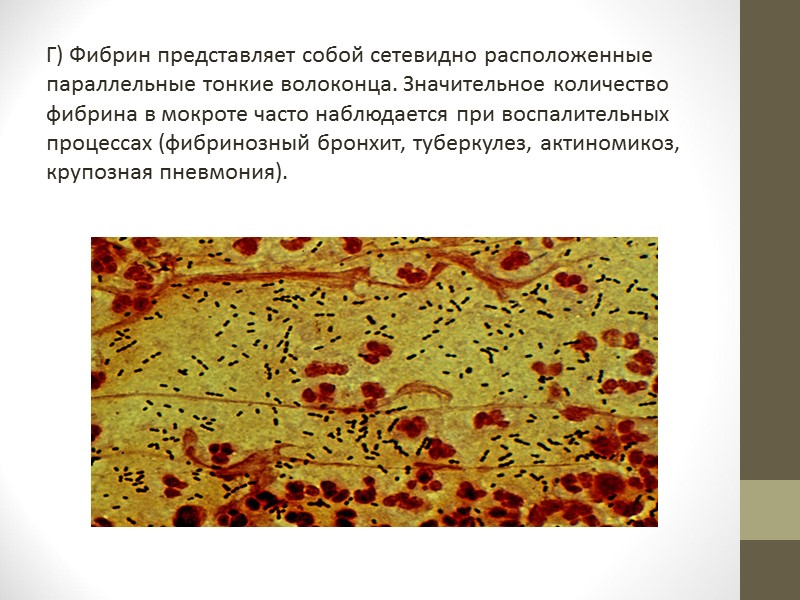 Г) Фибрин представляет собой сетевидно расположенные параллельные тонкие волоконца. Значительное количество фибрина в мокроте часто наблюдается при воспалительных процессах (фибринозный бронхит, туберкулез, актиномикоз, крупозная пневмония).