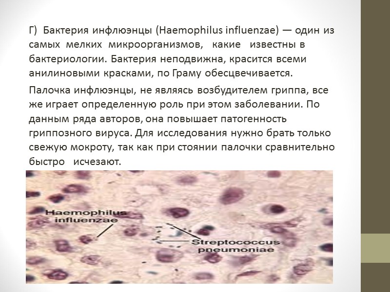 Г) Бактерия инфлюэнцы (Haemophilus influenzae) — один из самых мелких микроорганизмов, какие известны в бактериологии. Бактерия неподвижна, красится всеми анилиновыми красками, по Граму обесцвечивается. Палочка инфлюэнцы, не являясь возбудителем гриппа, все же играет определенную роль при этом заболевании. По данным ряда авторов, она повышает патогенность гриппозного вируса. Для исследования нужно брать только свежую мокроту, так как при стоянии палочки сравнительно быстро исчезают.