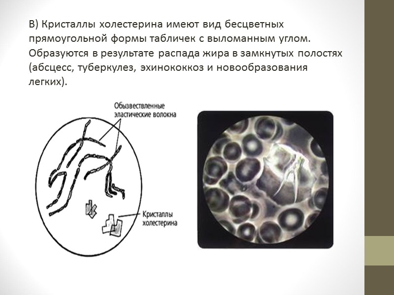 В) Кристаллы холестерина имеют вид бесцветных прямоугольной формы табличек с выломанным углом. Образуются в результате распада жира в замкнутых полостях (абсцесс, туберкулез, эхинококкоз и новообразования легких).