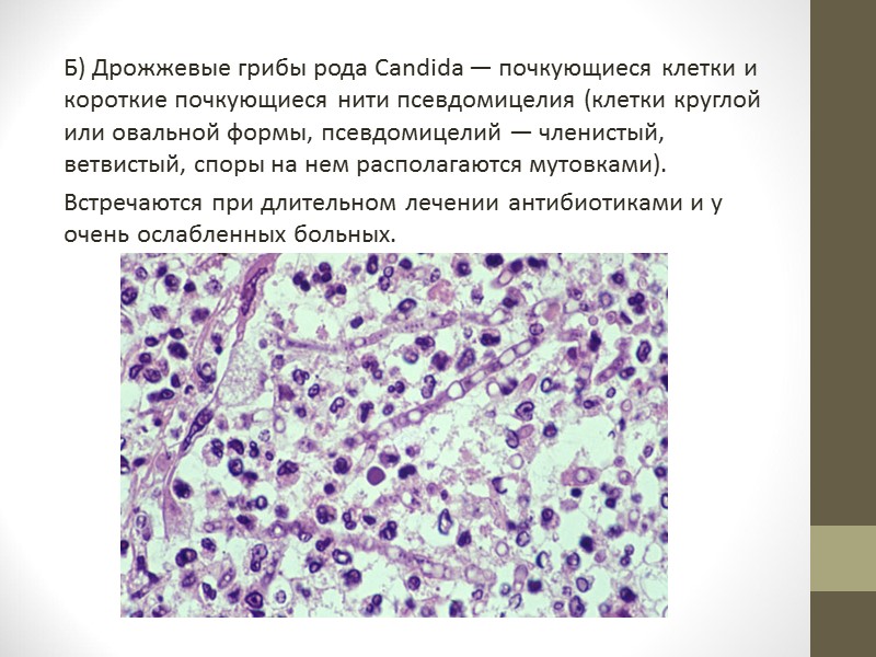 Б) Дрожжевые грибы рода Candida — почкующиеся клетки и короткие почкующиеся нити псевдомицелия (клетки круглой или овальной формы, псевдомицелий — членистый, ветвистый, споры на нем располагаются мутовками). Встречаются при длительном лечении антибиотиками и у очень ослабленных больных.