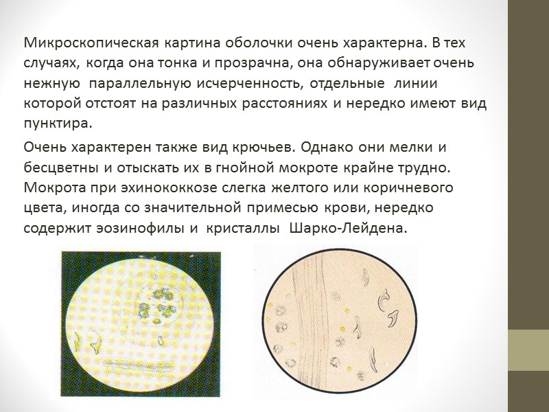 Микроскопическая картина оболочки очень характерна. В тех случаях, когда она тонка и прозрачна, она обнаруживает очень нежную параллельную исчерченность, отдельные линии которой отстоят на различных расстояниях и нередко имеют вид пунктира. Очень характерен также вид крючьев. Однако они мелки и бесцветны и отыскать их в гнойной мокроте крайне трудно. Мокрота при эхинококкозе слегка желтого или коричневого цвета, иногда со значительной примесью крови, нередко содержит эозинофилы и кристаллы Шарко-Лейдена.