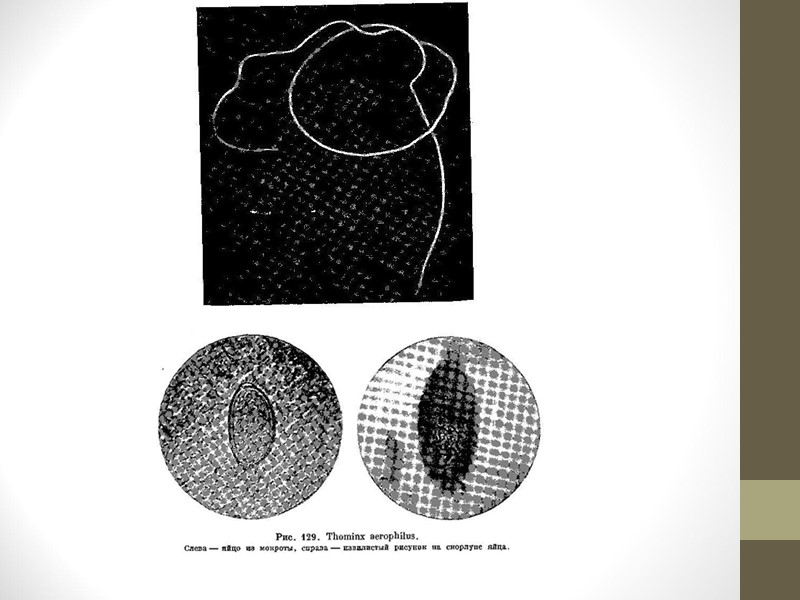 Д) Thominx aerophilus —томинкс . Очень тонкая нематода, паразитирующая в трахее, легких и носовой полости. Самец до 17 мм длины, самка 18—19 мм. Яйца бочкообразной формы, очень похожие на яйца власоглава, но несколько длиннее и шире. Одна сторона их уплощена. Толстая оболочка яиц покрыта сложным узорчатым барельефом, который удается рассмотреть только при очень тщательном микроскопическом изучении. Размер яиц 0,065— 0,071x0,029—0,031мм. Яйца обнаруживаются в мокроте. При проглатывании мокроты они попадают в дуоденальный сок и фекальные массы. Яйца в мокроте сероватого цвета, в фекалиях коричневатого. Заболевание легких, вызываемое этим паразитом, характеризуется выделением большого количества вязкой гнойной мокроты.