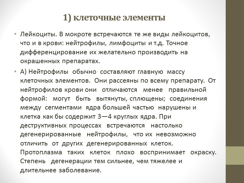 1) клеточные элементы Лейкоциты. В мокроте встречаются те же виды лейкоцитов, что и в крови: нейтрофилы, лимфоциты и т.д. Точное дифференцирование их желательно производить на окрашенных препаратах. А) Нейтрофилы обычно составляют главную массу клеточных элементов. Они рассеяны по всему препарату. От нейтрофилов крови они отличаются менее правильной формой: могут быть вытянуты, сплющены; соединения между сегментами ядра большей частью нарушены и клетка как бы содержит 3—4 круглых ядра. При деструктивных процессах встречаются настолько дегенерированные нейтрофилы, что их невозможно отличить от других дегенерированных клеток. Протоплазма таких клеток плохо воспринимает окраску. Степень дегенерации тем сильнее, чем тяжелее и длительнее заболевание.