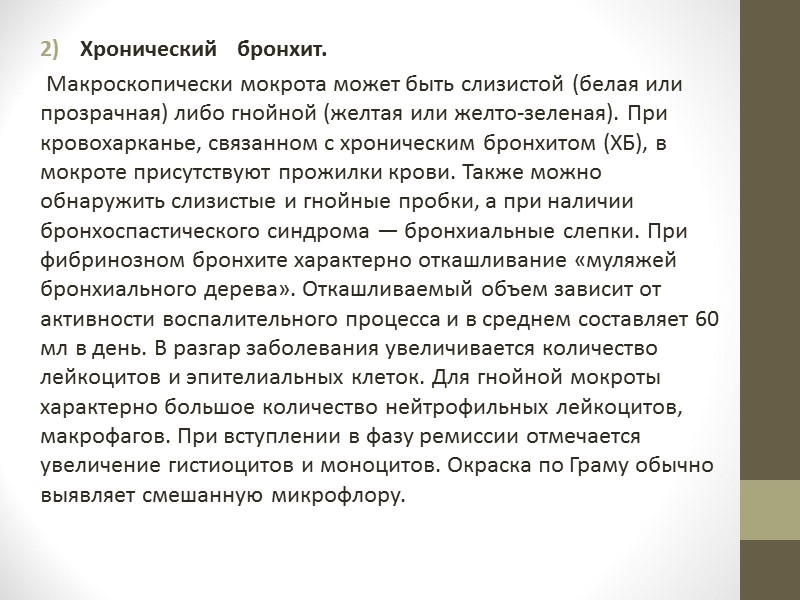 Хронический бронхит. Макроскопически мокрота может быть слизистой (белая или прозрачная) либо гнойной (желтая или желто-зеленая). При кровохарканье, связанном с хроническим бронхитом (ХБ), в мокроте присутствуют прожилки крови. Также можно обнаружить слизистые и гнойные пробки, а при наличии бронхоспастического синдрома — бронхиальные слепки. При фибринозном бронхите характерно откашливание «муляжей бронхиального дерева». Откашливаемый объем зависит от активности воспалительного процесса и в среднем составляет 60 мл в день. В разгар заболевания увеличивается количество лейкоцитов и эпителиальных клеток. Для гнойной мокроты характерно большое количество нейтрофильных лейкоцитов, макрофагов. При вступлении в фазу ремиссии отмечается увеличение гистиоцитов и моноцитов. Окраска по Граму обычно выявляет смешанную микрофлору.