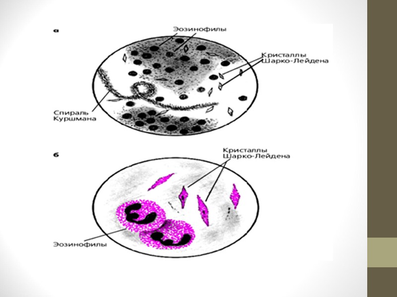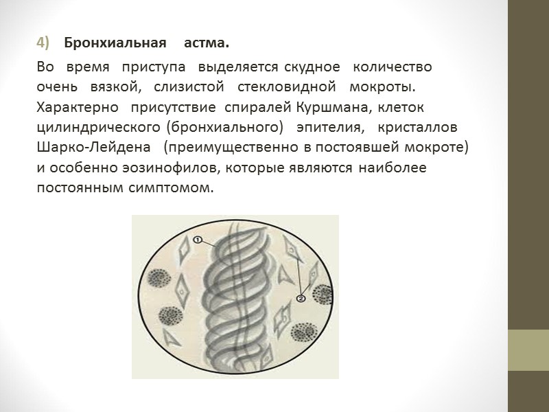 Бронхиальная астма. Во время приступа выделяется скудное количество очень вязкой, слизистой стекловидной мокроты. Характерно присутствие спиралей Куршмана, клеток цилиндрического (бронхиального) эпителия, кристаллов Шарко-Лейдена (преимущественно в постоявшей мокроте) и особенно эозинофилов, которые являются наиболее постоянным симптомом.