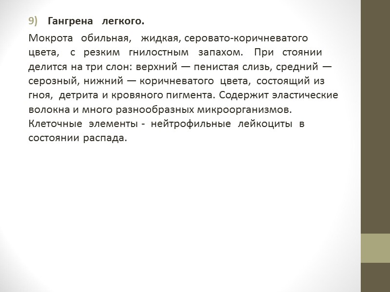 Гангрена легкого. Мокрота обильная, жидкая, серовато-коричневатого цвета, с резким гнилостным запахом. При стоянии делится на три слон: верхний — пенистая слизь, средний —серозный, нижний — коричневатого цвета, состоящий из гноя, детрита и кровяного пигмента. Содержит эластические волокна и много разнообразных микроорганизмов. Клеточные элементы - нейтрофильные лейкоциты в состоянии распада.