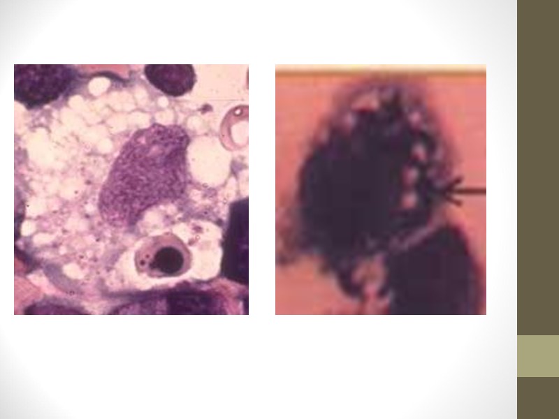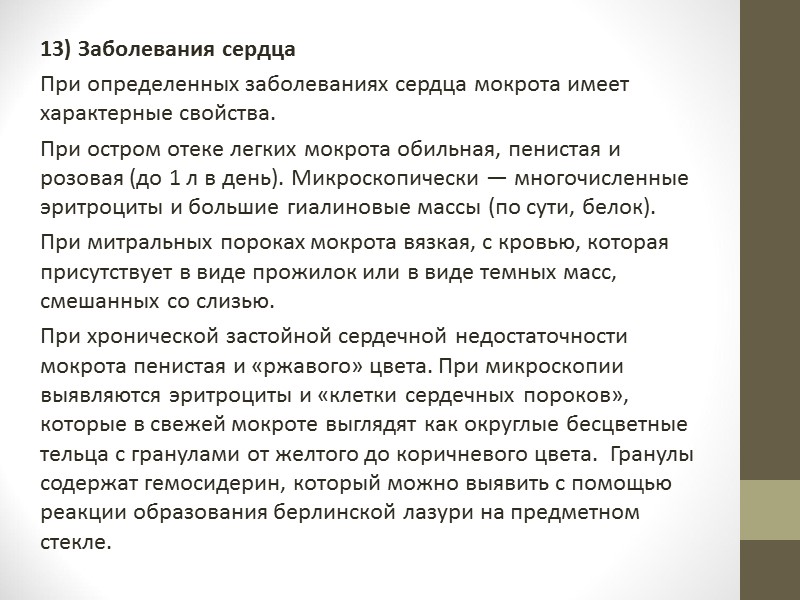 13) Заболевания сердца При определенных заболеваниях сердца мокрота имеет характерные свойства. При остром отеке легких мокрота обильная, пенистая и розовая (до 1 л в день). Микроскопически — многочисленные эритроциты и большие гиалиновые массы (по сути, белок). При митральных пороках мокрота вязкая, с кровью, которая присутствует в виде прожилок или в виде темных масс, смешанных со слизью. При хронической застойной сердечной недостаточности мокрота пенистая и «ржавого» цвета. При микроскопии выявляются эритроциты и «клетки сердечных пороков», которые в свежей мокроте выглядят как округлые бесцветные тельца с гранулами от желтого до коричневого цвета. Гранулы содержат гемосидерин, который можно выявить с помощью реакции образования берлинской лазури на предметном стекле.