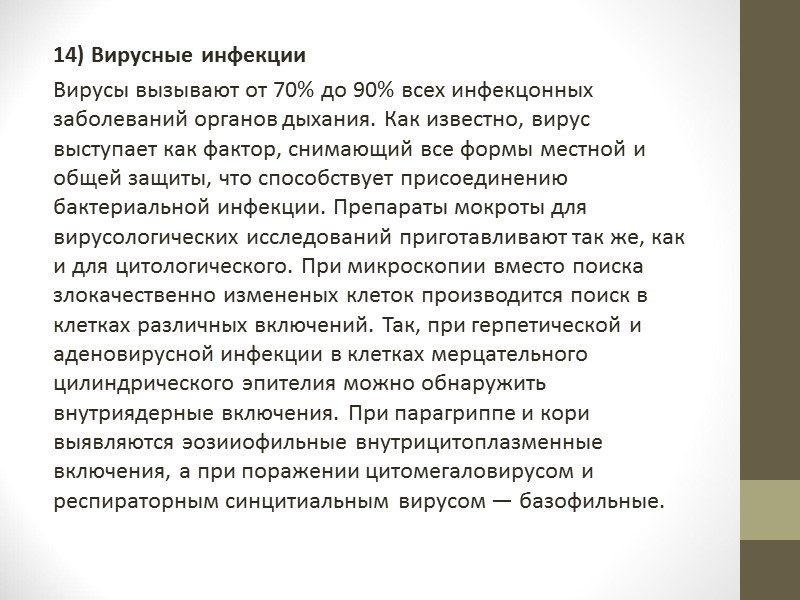 14) Вирусные инфекции Вирусы вызывают от 70% до 90% всех инфекцонных заболеваний органов дыхания. Как известно, вирус выступает как фактор, снимающий все формы местной и общей защиты, что способствует присоединению бактериальной инфекции. Препараты мокроты для вирусологических исследований приготавливают так же, как и для цитологического. При микроскопии вместо поиска злокачественно измененых клеток производится поиск в клетках различных включений. Так, при герпетической и аденовирусной инфекции в клетках мерцательного цилиндрического эпителия можно обнаружить внутриядерные включения. При парагриппе и кори выявляются эозииофильные внутрицитоплазменные включения, а при поражении цитомегаловирусом и респираторным синцитиальным вирусом — базофильные.
