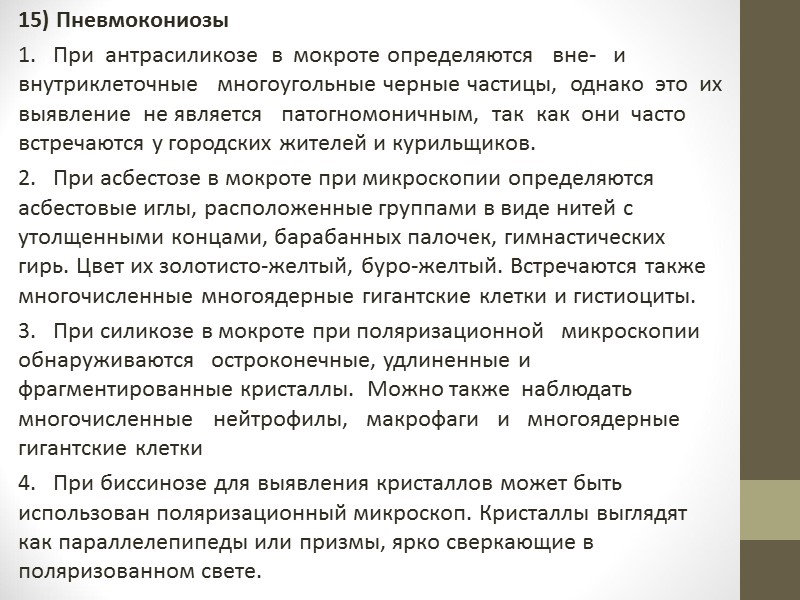 15) Пневмокониозы 1. При антрасиликозе в мокроте определяются вне- и внутриклеточные многоугольные черные частицы, однако это их выявление не является патогномоничным, так как они часто встречаются у городских жителей и курильщиков. 2. При асбестозе в мокроте при микроскопии определяются асбестовые иглы, расположенные группами в виде нитей с утолщенными концами, барабанных палочек, гимнастических гирь. Цвет их золотисто-желтый, буро-желтый. Встречаются также многочисленные многоядерные гигантские клетки и гистиоциты. 3. При силикозе в мокроте при поляризационной микроскопии обнаруживаются остроконечные, удлиненные и фрагментированные кристаллы. Можно также наблюдать многочисленные нейтрофилы, макрофаги и многоядерные гигантские клетки 4. При биссинозе для выявления кристаллов может быть использован поляризационный микроскоп. Кристаллы выглядят как параллелепипеды или призмы, ярко сверкающие в поляризованном свете.