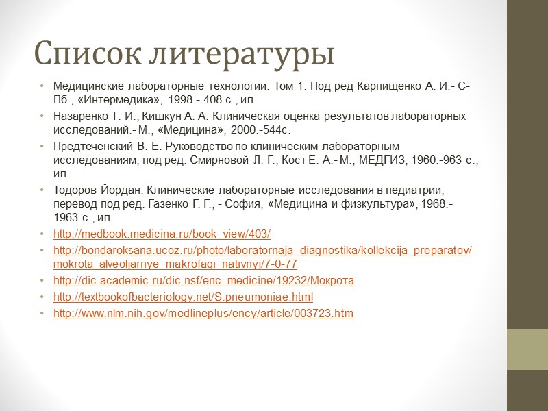 Список литературы Медицинские лабораторные технологии. Том 1. Под ред Карпищенко А. И.- С-Пб., «Интермедика», 1998.- 408 с., ил. Назаренко Г. И., Кишкун А. А. Клиническая оценка результатов лабораторных исследований.- М., «Медицина», 2000.-544с. Предтеченский В. Е. Руководство по клиническим лабораторным исследованиям, под ред. Смирновой Л. Г., Кост Е. А.- М., МЕДГИЗ, 1960.-963 с., ил. Тодоров Йордан. Клинические лабораторные исследования в педиатрии, перевод под ред. Газенко Г. Г., - София, «Медицина и физкультура», 1968.-1963 с., ил. http://medbook.medicina.ru/book_view/403/ http://bondaroksana.ucoz.ru/photo/laboratornaja_diagnostika/kollekcija_preparatov/mokrota_alveoljarnye_makrofagi_nativnyj/7-0-77 http://dic.academic.ru/dic.nsf/enc_medicine/19232/Мокрота http://textbookofbacteriology.net/S.pneumoniae.html http://www.nlm.nih.gov/medlineplus/ency/article/003723.htm