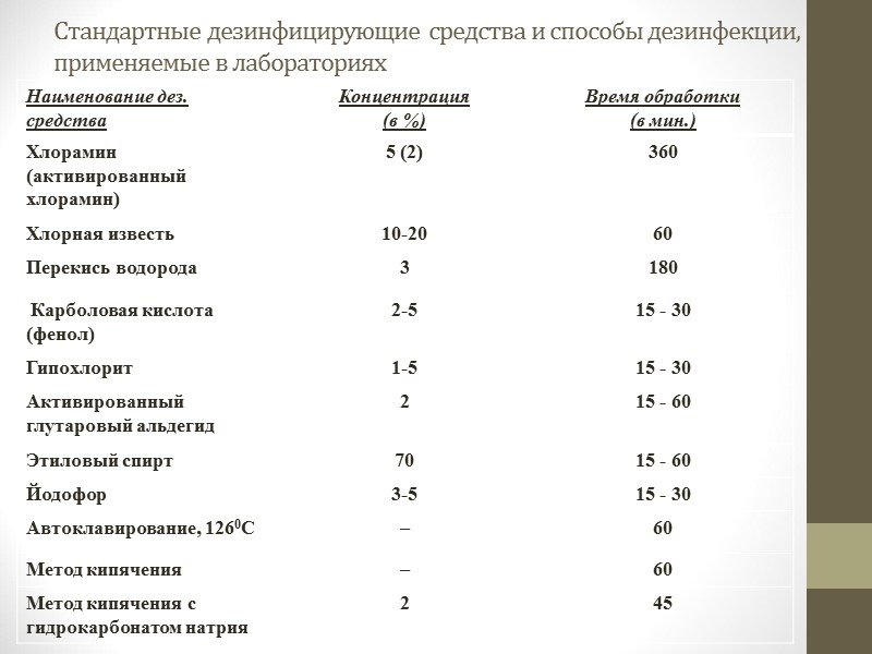 Стандартные дезинфицирующие средства и способы дезинфекции, применяемые в лабораториях