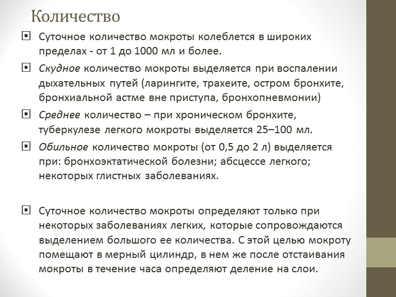 Количество Суточное количество мокроты колеблется в широких пределах - от 1 до 1000 мл и более. Скудное количество мокроты выделяется при воспалении дыхательных путей (ларингите, трахеите, остром бронхите, бронхиальной астме вне приступа, бронхопневмонии) Среднее количество – при хроническом бронхите, туберкулезе легкого мокроты выделяется 25–100 мл. Обильное количество мокроты (от 0,5 до 2 л) выделяется при: бронхоэктатической болезни; абсцессе легкого; некоторых глистных заболеваниях. Суточное количество мокроты определяют только при некоторых заболеваниях легких, которые сопровождаются выделением большого ее количества. С этой целью мокроту помещают в мерный цилиндр, в нем же после отстаивания мокроты в течение часа определяют деление на слои.