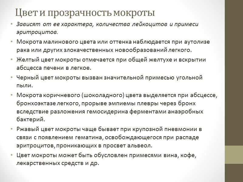Цвет и прозрачность мокроты Зависят от ее характера, количества лейкоцитов и примеси эритроцитов. Мокрота малинового цвета или оттенка наблюдается при аутолизе рака или других злокачественных новообразований легкого. Желтый цвет мокроты отмечается при общей желтухе и вскрытии абсцесса печени в легкое. Черный цвет мокроты вызван значительной примесью угольной пыли. Мокрота коричневого (шоколадного) цвета выделяется при абсцессе, бронхоэктазе легкого, прорыве эмпиемы плевры через бронх вследствие разложения гемосидерина ферментами анаэробных бактерий. Ржавый цвет мокроты чаще бывает при крупозной пневмонии в связи с появлением гематина, освобождающегося при распаде эритроцитов, проникающих в просвет альвеол. Цвет мокроты может быть обусловлен примесями вина, кофе, лекарственных средств и др.
