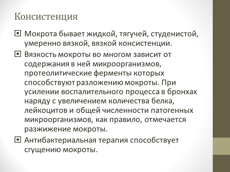 Консистенция Мокрота бывает жидкой, тягучей, студенистой, умеренно вязкой, вязкой консистенции. Вязкость мокроты во многом зависит от содержания в ней микроорганизмов, протеолитические ферменты которых способствуют разложению мокроты. При усилении воспалительного процесса в бронхах наряду с увеличением количества белка, лейкоцитов и общей численности патогенных микроорганизмов, как правило, отмечается разжижение мокроты. Антибактериальная терапия способствует сгущению мокроты.