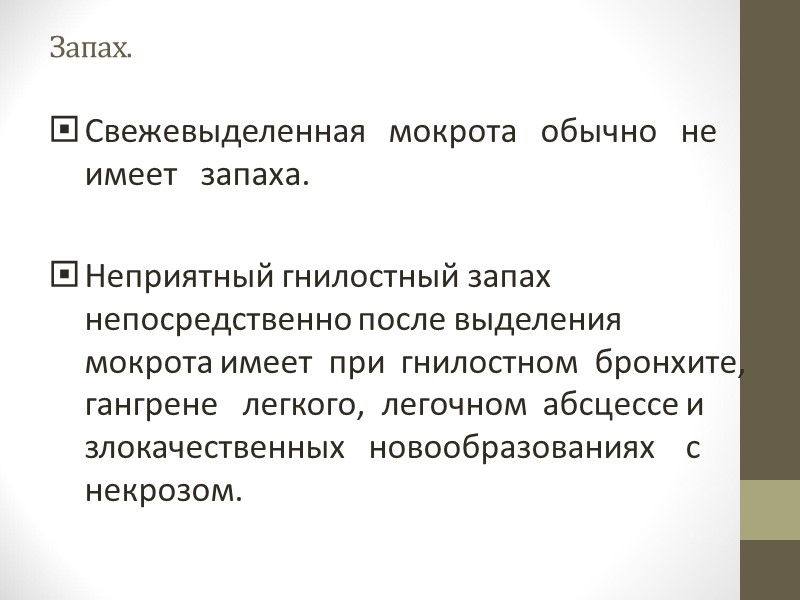 Запах. Свежевыделенная мокрота обычно не имеет запаха. Неприятный гнилостный запах непосредственно после выделения мокрота имеет при гнилостном бронхите, гангрене легкого, легочном абсцессе и злокачественных новообразованиях с некрозом.