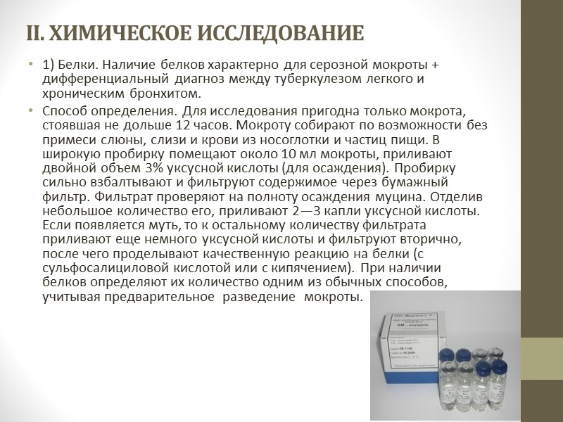 II. ХИМИЧЕСКОЕ ИССЛЕДОВАНИЕ 1) Белки. Наличие белков характерно для серозной мокроты + дифференциальный диагноз между туберкулезом легкого и хроническим бронхитом. Способ определения. Для исследования пригодна только мокрота, стоявшая не дольше 12 часов. Мокроту собирают по возможности без примеси слюны, слизи и крови из носоглотки и частиц пищи. В широкую пробирку помещают около 10 мл мокроты, приливают двойной объем 3% уксусной кислоты (для осаждения). Пробирку сильно взбалтывают и фильтруют содержимое через бумажный фильтр. Фильтрат проверяют на полноту осаждения муцина. Отделив небольшое количество его, приливают 2—3 капли уксусной кислоты. Если появляется муть, то к остальному количеству фильтрата приливают еще немного уксусной кислоты и фильтруют вторично, после чего проделывают качественную реакцию на белки (с сульфосалициловой кислотой или с кипячением). При наличии белков определяют их количество одним из обычных способов, учитывая предварительное разведение мокроты.