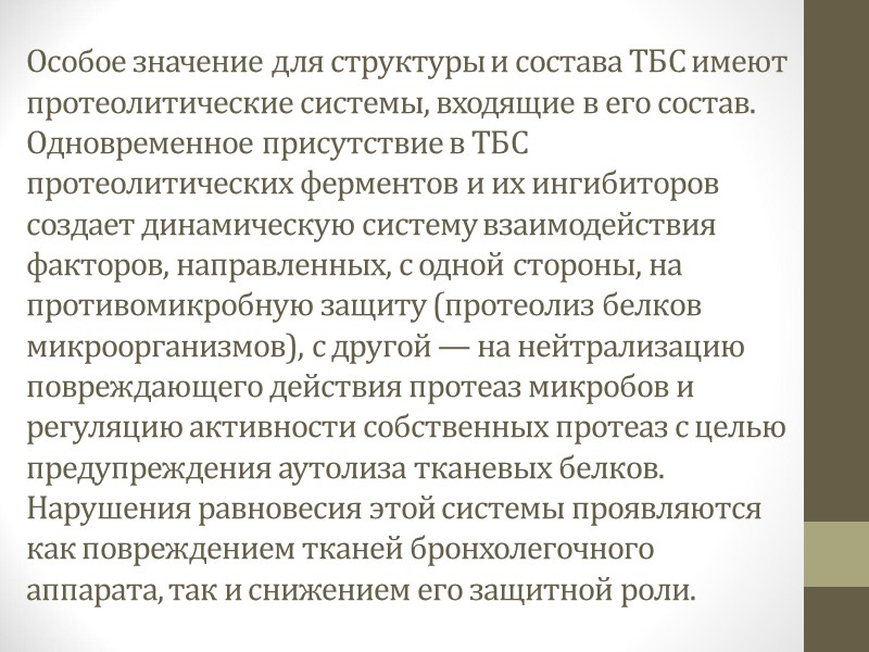 Особое значение для структуры и состава ТБС имеют протеолитические системы, входящие в его состав. Одновременное присутствие в ТБС протеолитических ферментов и их ингибиторов создает динамическую систему взаимодействия факторов, направленных, с одной стороны, на противомикробную защиту (протеолиз белков микроорганизмов), с другой — на нейтрализацию повреждающего действия протеаз микробов и регуляцию активности собственных протеаз с целью предупреждения аутолиза тканевых белков. Нарушения равновесия этой системы проявляются как повреждением тканей бронхолегочного аппарата, так и снижением его защитной роли.