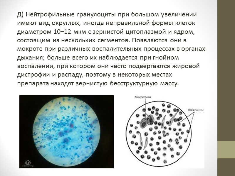 Д) Нейтрофильные гранулоциты при большом увеличении имеют вид округлых, иногда неправильной формы клеток диаметром 10–12 мкм с зернистой цитоплазмой и ядром, состоящим из нескольких сегментов. Появляются они в мокроте при различных воспалительных процессах в органах дыхания; больше всего их наблюдается при гнойном воспалении, при котором они часто подвергаются жировой дистрофии и распаду, поэтому в некоторых местах препарата находят зернистую бесструктурную массу.