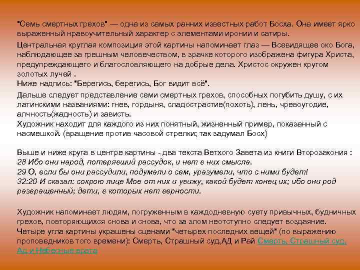"Семь смертных грехов" — одна из самых ранних известных работ Босха. Она имеет ярко выраженный нравоучительный характер с элементами иронии и сатиры. Центральная круглая композиция этой картины напоминает глаз — Всевидящее око Бога, наблюдающее за грешным человечеством, в зрачке которого изображена фигура Христа, предупреждающего и благословляющего на добрые дела. Христос окружен кругом золотых лучей. Ниже надпись: "Берегись, берегись, Бог видит всё". Дальше следует представлениe семи смертных грехов, способных погубить душу, с их латинскими названиями: гнев, гордыня, сладострастие(похоть), лень, чревоугодие, алчность(жадность) и зависть. Художник находит для каждого из них понятный, жизненный пример, показанный с насмешкой. (вращение против часовой стрелки; так задумал Босх) Выше и ниже круга в центре картины - два текста Ветхого Завета из книги Второзакония : 28 Ибо они народ, потерявший рассудок, и нет в них смысла. 29 О, если бы они рассудили, подумали о сем, уразумели, что с ними будет! 32: 20 И сказал: сокрою лице Мое от них и увижу, какой будет конец их; ибо они род развращенный; дети, в которых нет верности. Художник напоминает людям, погруженным в каждодневную суету привычных, будничных грехов, повторяющихся снова и снова, что за злом неотступно следует воздаяние. Четыре угла картины украшены сценами "четырех последних вещей" (по выражению проповедников того времени): Смерть, Страшный суд, АД и Рай Смерть, Страшный суд, Ад и Небесные врата