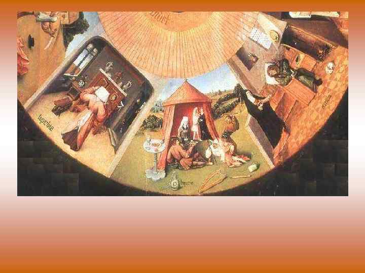 • 2. Слева видим сцену показывающую ГОРДЫНЮ Женщина любуется собой, глядя в зеркало, педлагаемое демоном. Зеркало часто используется Босхом, чтобы показать гордыню, тщеславие, которые внушает демон. 3. В центре — сцена, показываюшая СЛАДОСТРАСТИЕ, ПОХОТЬ. В палатке — две влюблённые пары, занятые прелюдией к полному выражению страсти. Их развлекают клоуны, рядом музыкальные инструменты. Со времен раннего христианства отцы церкви всячески поносили "непристойные пляски и телодвижения", "низкие и бесстыдные песни" праздношатающихся потешников. Они клеймили бродячих актеров и актрис как "детей сатаны" и "вавилонских блудниц" — людей безнравственных, распущенных, возбуждаемых "демоном блуда". В связи с безнравственной музыкой бичевал разврат и Иероним Босх, который возводил в абсолют греховность земного существования. На его картинах музыкальные инструменты — символ похоти.