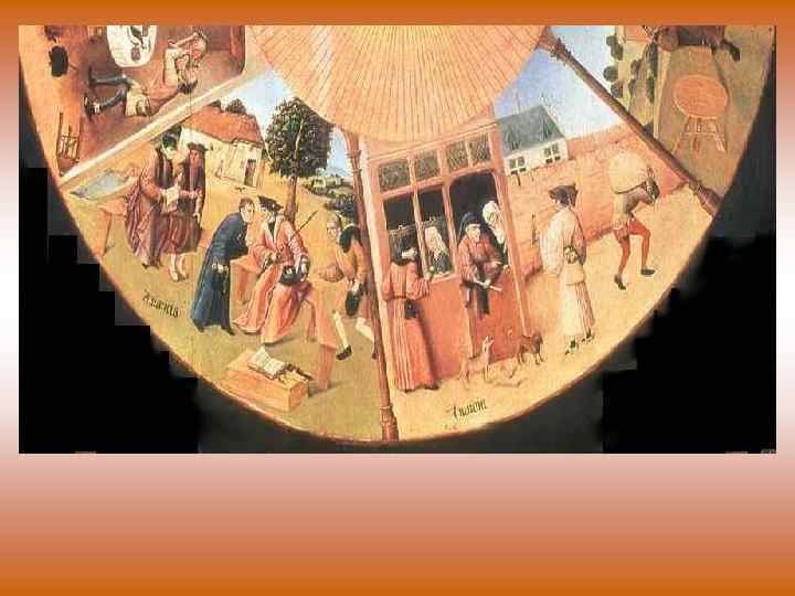 • 4. ЛЕНЬ(уныние) показывает сцена слева. Женщина, пришедшая к священнику(или монахиня), пытается призвать его выполнять свои обязанности, о которых он забыл(то ли уснув, то ли предавшись мечтам) 5. О ЧРЕВОУГОДИИ, ненасытности говорит центральная сцена. Взъерошенный, полный человек ест и не может насытиться. Ребёнок просящий есть, худой человек, которого не приглашают к столу, бедная обстановка комнаты говорят: ненасытность приводит к бедности и эгоизму.