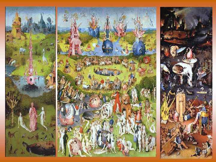 • Композиция левой створки продолжает тему сотворения мира и посвящена рождению человека. В центральной части триптиха раскинулся чудесный волшебный «сад любви» , населенный множеством обнаженных фигурок мужчин и женщин. На правой створке показан Ад По формату триптих традиционен для нидерландских алтарей, но содержание показывает, что Босх не предназначал его для церкви.