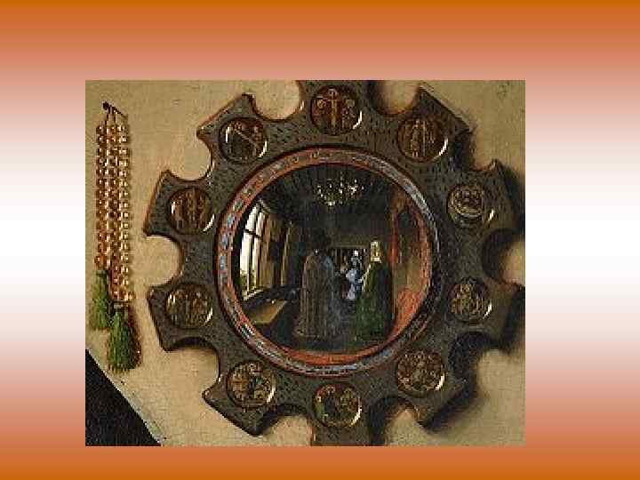 Свадебный портрет Джованни Арнольфини и его невесты • Супруги изображены стоящими в спальне. Они держат друга за руки в момент торжественной клятвы в присутствии двух свидетелей, чьи отражения видны в зеркале, висящем на стене. Один из свидетелей – сам художник, о чем говорит надпись над зеркалом: «Johannes de Eyck fuit hic» ( «Ян ван Эйк был здесь» ).