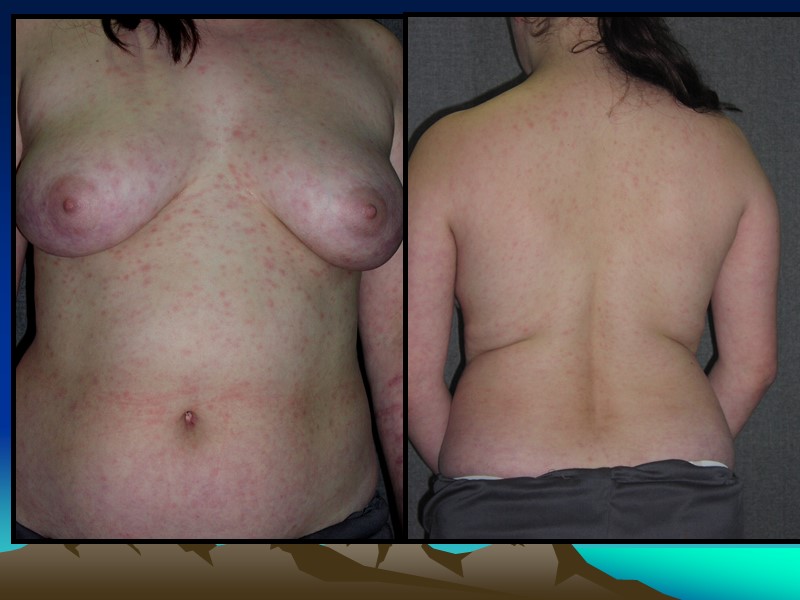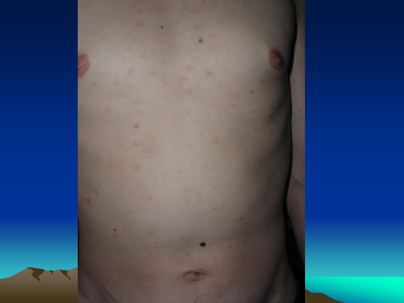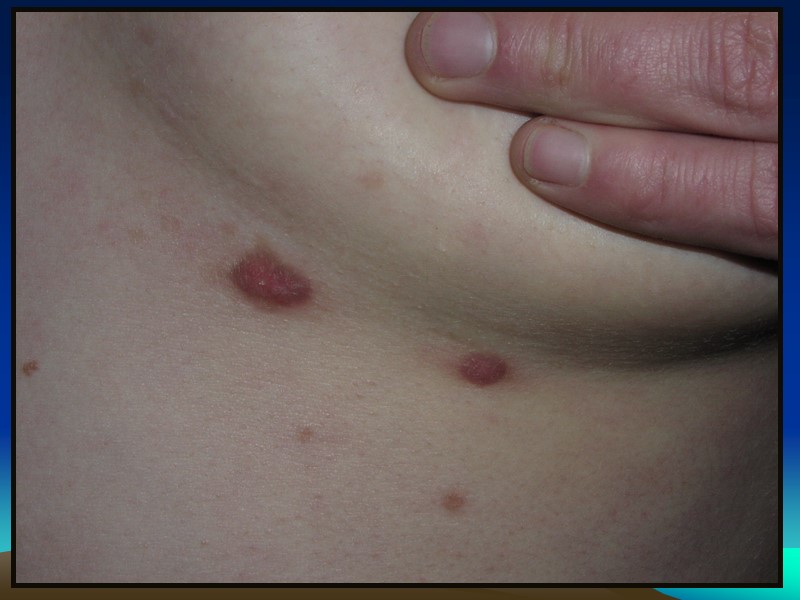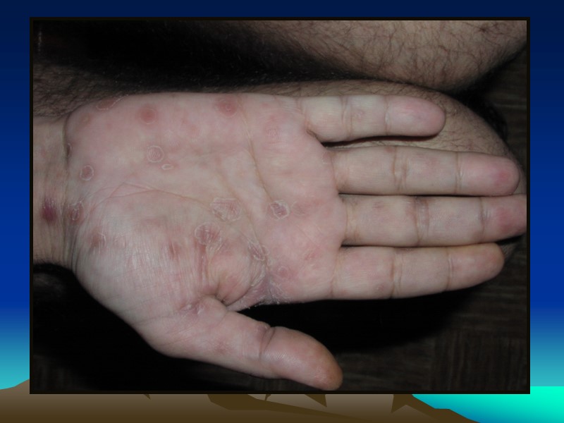 Дифференцировать сиф. розеолу следует с: Инфекционной розеолой (корь, краснуха) Токсической розеолой Разноцветным лишаем Розовым лишаем Жибера Пятнами от укусов лобковых вшей «Мраморной» кожей