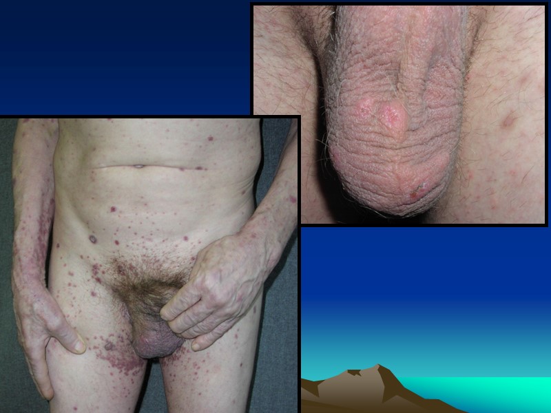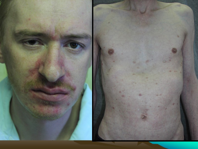 Тот же больной, вторичный свежий сифилис: остатки множественных шанкров на слизистой полости рта и красной кайме губ, импетигинозные сифилиды на туловище.