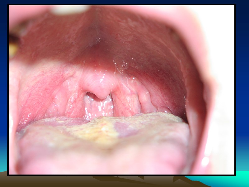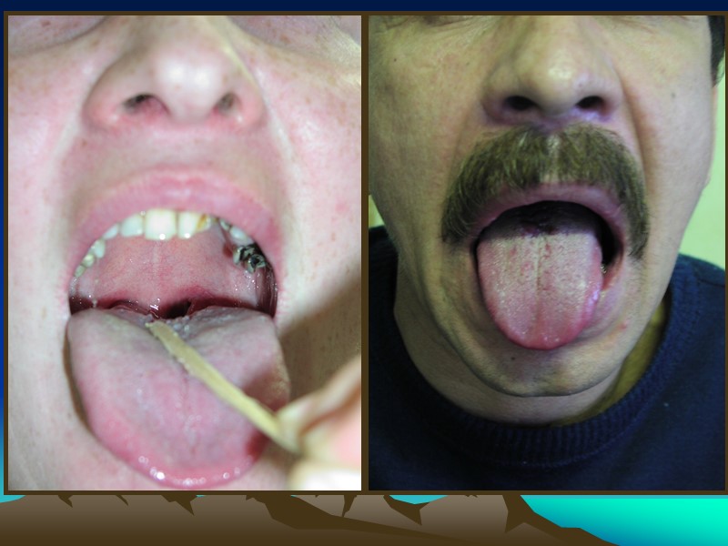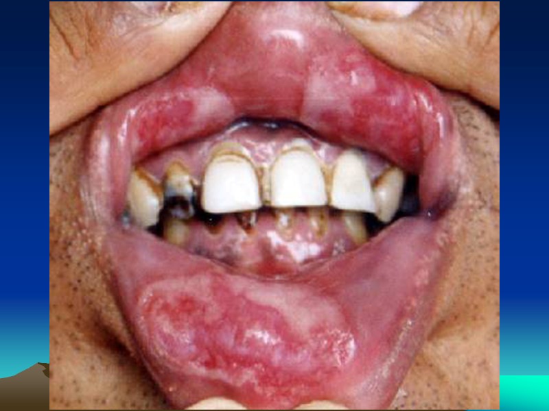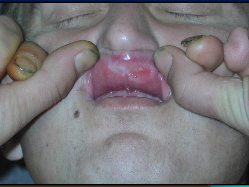 3. Папулёзные сифилиды слизистых оболочек полости рта имеют особенности: Папулы плотные, округлые, чётко отграниченные Плотноватой консистенции Отсутствует периферический воспалительный ободок Цвет белесовато-опаловый Часто не вызывают никаких ошущений Могут эрозироваться или реже – изъязвляться. 4. Пустулёзно - язвенный сифилид на слизистых оболочках наблюдается редко и обычно является спутником злокачественного сифилиса. Язвы глубокие, покрыты гнойным налётом, болезненны, T0 тела повышена. Пустулёзно-язвенный сифилид слизистых оболочек сочетается с глубокими пустулёзными сифилидами на коже.