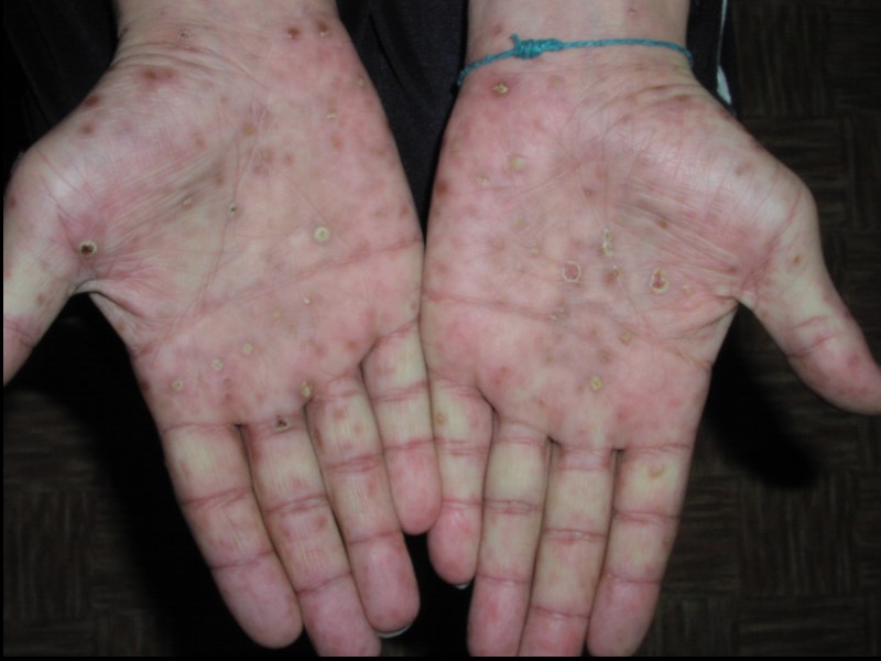 Оспенновидный сифилид Корки у больного с пустулезными сифилидами и сопутствующей чесоткой