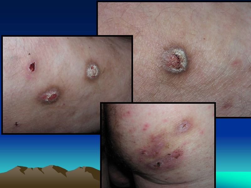 Варианты пустулезного сифилида: Импетигинозный Угревидный Оспенновидный Сифилитическая эктима Сифилитическая рупия Глубокие гнойнички (эктима и рупия) встречаются редко и, как правило, в рецидивной стадии болезни От пиококковых элементов пустулёзный сифилид отличается: Неострой воспалительной реакцией Плотным, безболезненным, резко отграниченным от окружающей кожи инфильтратом в основании пустул 3. Одновременным наличием других сифилидов (розеол, папул) 4. Наличием полиаденита 5. Положительными серореакциями на сифилис