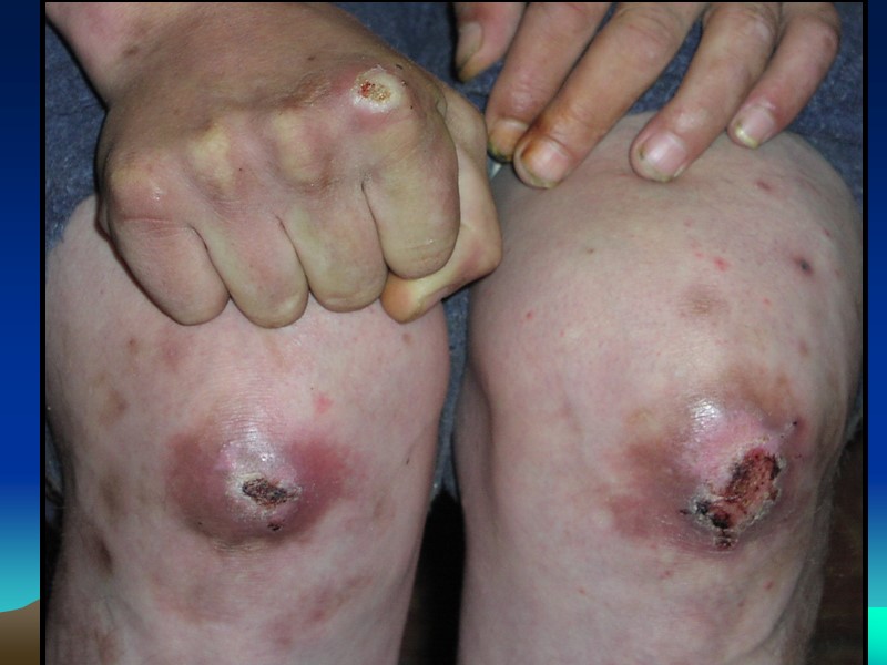 ПУСТУЛЁЗНЫЕ СИФИЛИДЫ (ПС) Общая характеристика ПС – наиболее редкое проявление вторичного сифилиса, признак тяжёлого злокачественного течение сифилиса, наблюдающийся у ослабленных больных. ПС имеют тенденцию к гнойному расплавлению специфи- ческого инфильтрата, изъязвлению, разрушению тканей и последующему образованию рубцов ПС сопровождаются нарушением общего состояния, лихорадкой, падением веса, потерей работоспособности головными, костными, мышечными болями.