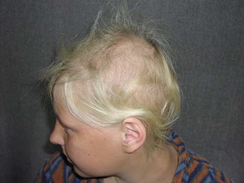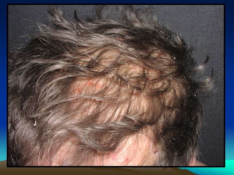 Сифилитическая алопеция чаще встречается у мужчин при рецидивном сифилисе, облысение более выражено в области висков Мелкоочаговая Диффузная Смешанная + Признак Пинкуса - ступенчатообразные ресницы («трамвайный или омнибусный» симптом): одновременно наблюдаются места отсутствующих ресниц, отрастающие и нормальной длины