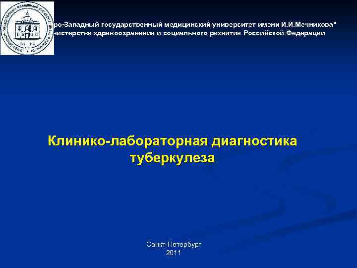 "Северо-Западный государственный медицинский университет имени И. И. Мечникова" Министерства здравоохранения и социального развития Российской Федерации Клинико-лабораторная диагностика туберкулеза Санкт-Петербург 2011