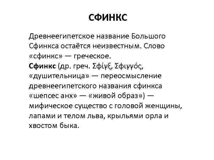 СФИНКС Древнеегипетское название Большого Сфинкса остаётся неизвестным. Слово «сфинкс» — греческое. Сфинкс (др. греч. Σφίγξ, Σφιγγός, «душительница» — переосмысление древнеегипетского названия сфинкса «шепсес анх» — «живой образ» ) — мифическое существо с головой женщины, лапами и телом льва, крыльями орла и хвостом быка.
