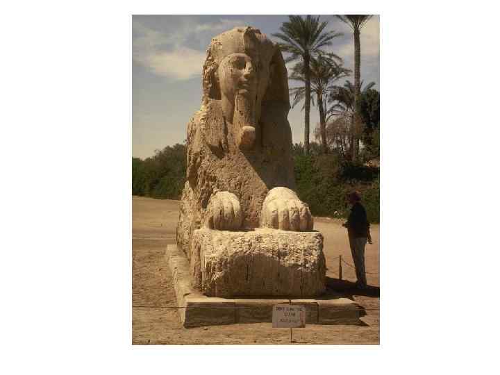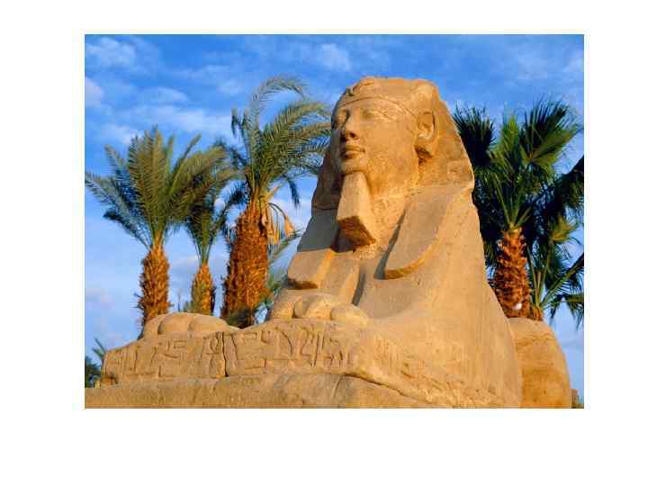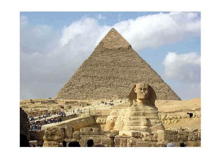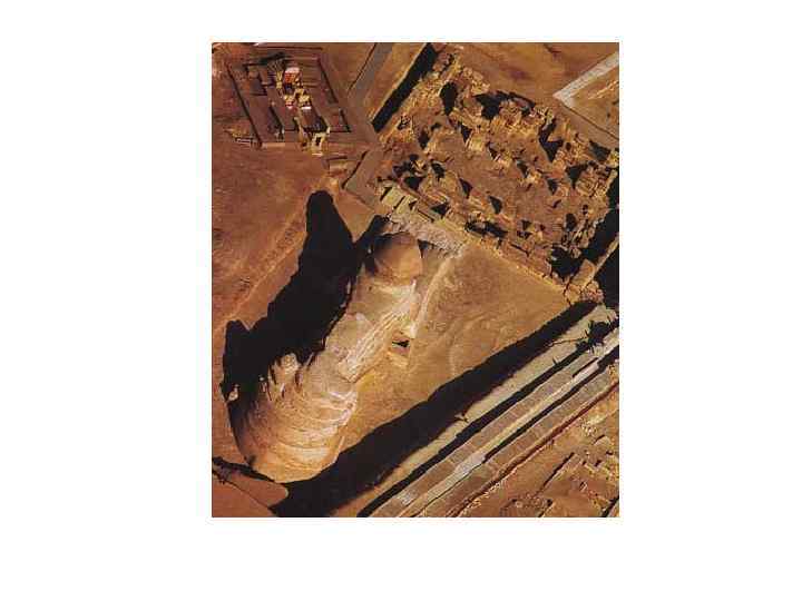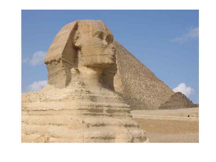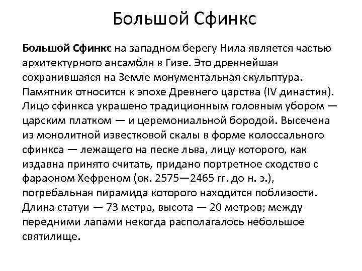 Большой Сфинкс на западном берегу Нила является частью архитектурного ансамбля в Гизе. Это древнейшая сохранившаяся на Земле монументальная скульптура. Памятник относится к эпохе Древнего царства (IV династия). Лицо сфинкса украшено традиционным головным убором — царским платком — и церемониальной бородой. Высечена из монолитной известковой скалы в форме колоссального сфинкса — лежащего на песке льва, лицу которого, как издавна принято считать, придано портретное сходство с фараоном Хефреном (ок. 2575— 2465 гг. до н. э. ), погребальная пирамида которого находится поблизости. Длина статуи — 73 метра, высота — 20 метров; между передними лапами некогда располагалось небольшое святилище.