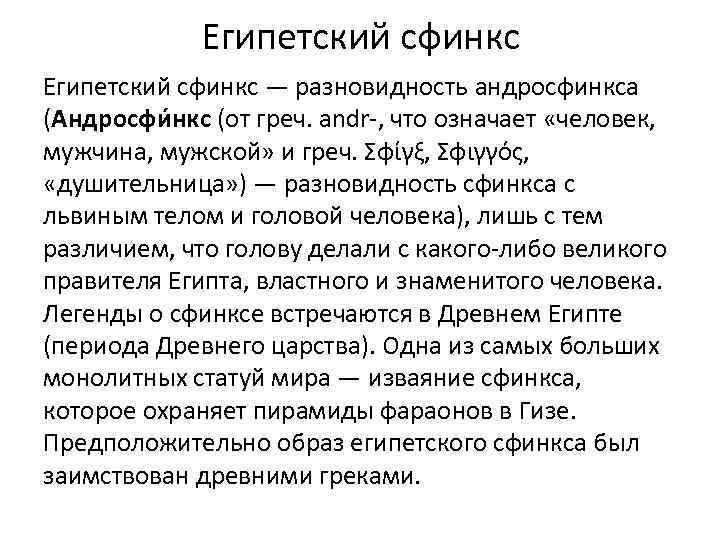 Египетский сфинкс — разновидность андросфинкса (Андросфи нкс (от греч. andr-, что означает «человек, мужчина, мужской» и греч. Σφίγξ, Σφιγγός, «душительница» ) — разновидность сфинкса с львиным телом и головой человека), лишь с тем различием, что голову делали с какого-либо великого правителя Египта, властного и знаменитого человека. Легенды о сфинксе встречаются в Древнем Египте (периода Древнего царства). Одна из самых больших монолитных статуй мира — изваяние сфинкса, которое охраняет пирамиды фараонов в Гизе. Предположительно образ египетского сфинкса был заимствован древними греками.