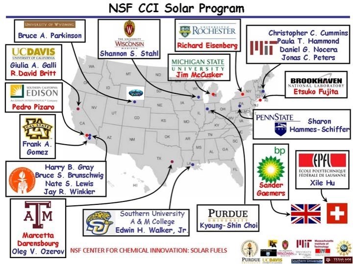 NSF CCI (Center for Chemical Innovation) Solar Program- Powering the Planet http: //www. ccisolar. caltech. edu/ • Goal to develop efficient, inexpensive, sustainable way(s) to convert solar energy into stored chemical fuel(s) • Ideally to split water with sunlight using cheap, safe, chemically stable, easilyobtained earth-abundant materials yielding hydrogen as chemical fuel • 3 component water splitting model