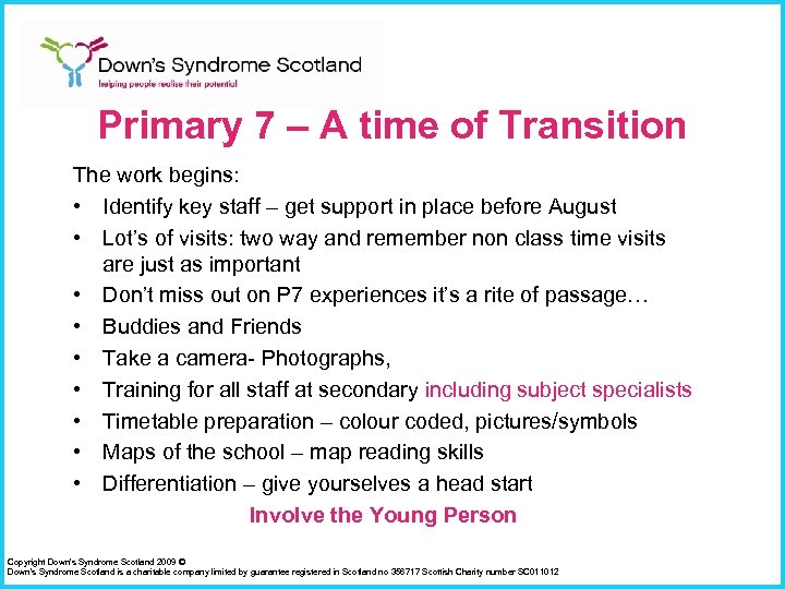 The Essential Elements for a Successful Transition • A positive attitude from receiving school. • A carefully prepared transition plan. • A timeous strategy for implementation. Copyright Down’s Syndrome Scotland 2009 © Down’s Syndrome Scotland is a charitable company limited by guarantee registered in Scotland no 356717 Scottish Charity number SC 011012