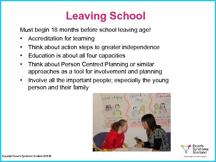 Leaving School Must begin 18 months before school leaving age! • Accreditation for learning • Think about action steps to greater independence • Education is about all four capacities • Think about Person Centred Planning or similar approaches as a tool for involvement and planning • Involve all the important people; especially the young person and their family Copyright Down’s Syndrome Scotland 2009 ©