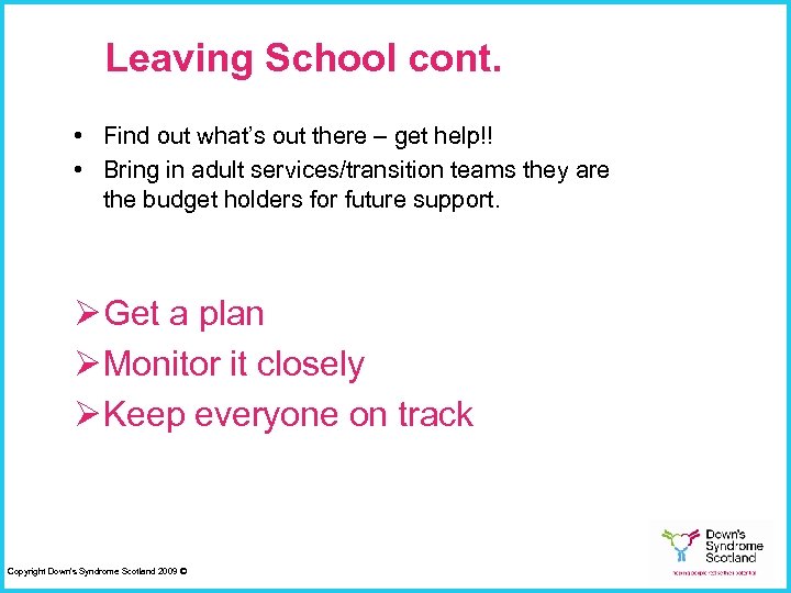 Leaving School cont. • Find out what’s out there – get help!! • Bring in adult services/transition teams they are the budget holders for future support. Ø Get a plan Ø Monitor it closely Ø Keep everyone on track Copyright Down’s Syndrome Scotland 2009 ©